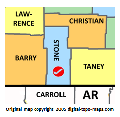 Thumbnail for version as of 13:34, 3 December 2018238 × 231 (23 KB)Bethcottam (talk | contribs)Map courtesy of [https://www.digital-topo-maps.com/county-map/missouri.shtml]. Copyright 2005.<br> Category:Missouri Maps Category:Stone County, Missouri