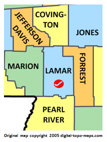 | current | ★ Approved revision 10:11, 26 April 2018 | 213 × 283 (33 KB) | Djheaven (talk | contribs) | Map courtesy of [https://www.digital-topo-maps.com/county-map/mississippi.shtml Digital-Topo-Maps.com]. Copyright 2005.<br> Category:Mississippi Maps Category:Lamar County, Mississippi |