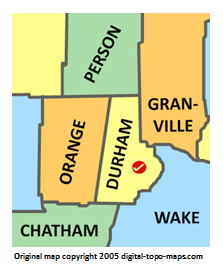 | current | ★ Approved revision 09:32, 24 April 2018 | 223 × 271 (29 KB) | Djheaven (talk | contribs) | Map courtesy of [https://www.digital-topo-maps.com/county-map/north-carolina.shtml Digital-Topo-Maps.com]. Copyright 2005.<br> Category:North Carolina Maps Category:Durham County, North Carolina |