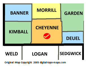 | current | ★ Approved revision 12:29, 16 April 2018 | 308 × 236 (24 KB) | Bethcottam (talk | contribs) | Map courtesy of [https://www.digital-topo-maps.com/county-map/nebraska.shtml]. Copyright 2005.<br> Category:Nebraska Maps Category:Cheyenne County, Nebraska | |