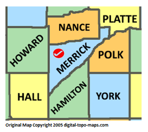 | current | ★ Approved revision 20:33, 29 April 2018 | 299 × 266 (40 KB) | Bethcottam (talk | contribs) | Map courtesy of [https://www.digital-topo-maps.com/county-map/nebraska.shtml]. Copyright 2005.<br> Category:Nebraska Maps Category:Merrick County, Nebraska |