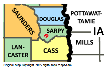| current | ★ Approved revision 08:12, 1 May 2018 | 344 × 225 (37 KB) | Bethcottam (talk | contribs) | Map courtesy of [https://www.digital-topo-maps.com/county-map/nebraska.shtml]. Copyright 2005.<br> Category:Nebraska Maps Category:Sarpy County, Nebraska |