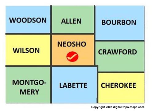 | current | ★ Approved revision 09:36, 13 September 2017 | 495 × 364 (31 KB) | Amberannelarsen (talk | contribs) | Map courtesy of [https://www.digital-topo-maps.com/county-map/kansas.shtml/ Digital-Topo-Maps.com]. Copyright 2005. Category:Kansas Maps Category: Neosho County, Kansas |