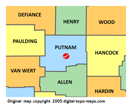 | current | ★ Approved revision 21:27, 18 November 2018 | 267 × 219 (20 KB) | Bethcottam (talk | contribs) | Map courtesy of [https://www.digital-topo-maps.com/county-map/ohio.shtml]. Copyright 2005.<br> Category:Ohio Maps Category:Putnam County, Ohio |
