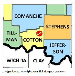 | current | ★ Approved revision 16:51, 30 March 2018 | 253 × 258 (31 KB) | Bethcottam (talk | contribs) | Map courtesy of [Oklahoma: https://www.digital-topo-maps.com/county-map/oklahoma.shtml]. Copyright 2005.<br> Category:Oklahoma Maps Category:Cotton County, Oklahoma |