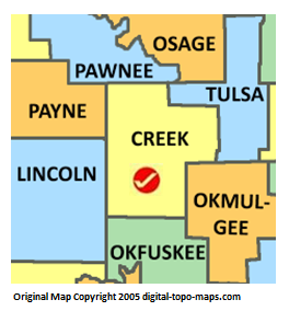 | current | ★ Approved revision 18:27, 30 March 2018 | 264 × 284 (38 KB) | Bethcottam (talk | contribs) | Map courtesy of [Oklahoma: https://www.digital-topo-maps.com/county-map/oklahoma.shtml]. Copyright 2005.<br> Category:Oklahoma Maps Category:Creek County, Oklahoma |