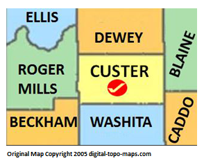 | current | ★ Approved revision 18:24, 31 March 2018 | 294 × 235 (109 KB) | Bethcottam (talk | contribs) | Map courtesy of [Oklahoma: https://www.digital-topo-maps.com/county-map/oklahoma.shtml]. Copyright 2005.<br> Category:Oklahoma Maps Category:Custer County, Oklahoma |