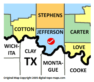 | current | ★ Approved revision 12:51, 3 April 2018 | 317 × 277 (40 KB) | Bethcottam (talk | contribs) | Map courtesy of [Oklahoma: https://www.digital-topo-maps.com/county-map/oklahoma.shtml]. Copyright 2005.<br> Category:Oklahoma Maps Category:Jefferson County, Oklahoma |