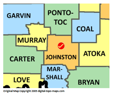 | current | ★ Approved revision 16:03, 3 April 2018 | 384 × 319 (64 KB) | Bethcottam (talk | contribs) | Map courtesy of [Oklahoma: https://www.digital-topo-maps.com/county-map/oklahoma.shtml]. Copyright 2005.<br> Category:Oklahoma Maps Category:Johnston County, Oklahoma |