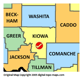 | current | ★ Approved revision 20:24, 3 April 2018 | 284 × 272 (38 KB) | Bethcottam (talk | contribs) | Map courtesy of [Oklahoma: https://www.digital-topo-maps.com/county-map/oklahoma.shtml]. Copyright 2005.<br> Category:Oklahoma Maps Category:Kiowa County, Oklahoma |