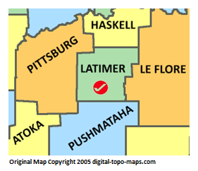 | current | ★ Approved revision 20:37, 3 April 2018 | 281 × 242 (31 KB) | Bethcottam (talk | contribs) | Map courtesy of [Oklahoma: https://www.digital-topo-maps.com/county-map/oklahoma.shtml]. Copyright 2005.<br> Category:Oklahoma Maps Category:Latimer County, Oklahoma |