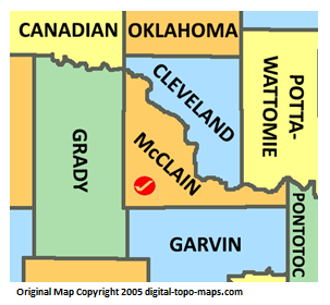 | current | ★ Approved revision 12:20, 4 April 2018 | 303 × 280 (40 KB) | Bethcottam (talk | contribs) | Map courtesy of [Oklahoma: https://www.digital-topo-maps.com/county-map/oklahoma.shtml]. Copyright 2005.<br> Category:Oklahoma Maps Category:McClain County, Oklahoma |