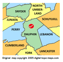| current | ★ Approved revision 08:50, 11 April 2018 | 217 × 211 (36 KB) | Djheaven (talk | contribs) | Map courtesy of [https://www.digital-topo-maps.com/county-map/pennsylvania.shtml Digital-Topo-Maps.com]. Copyright 2005.<br> Category:Pennsulvania Maps Category:Dauphin County, Pennsylvania |