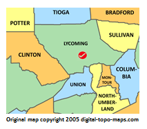 | current | ★ Approved revision 08:19, 11 April 2018 | 213 × 186 (25 KB) | Djheaven (talk | contribs) | Map courtesy of [https://www.digital-topo-maps.com/county-map/pennsylvania.shtml Digital-Topo-Maps.com]. Copyright 2005.<br> Category:Pennsulvania Maps Category:Lycoming County, Pennsylvania |