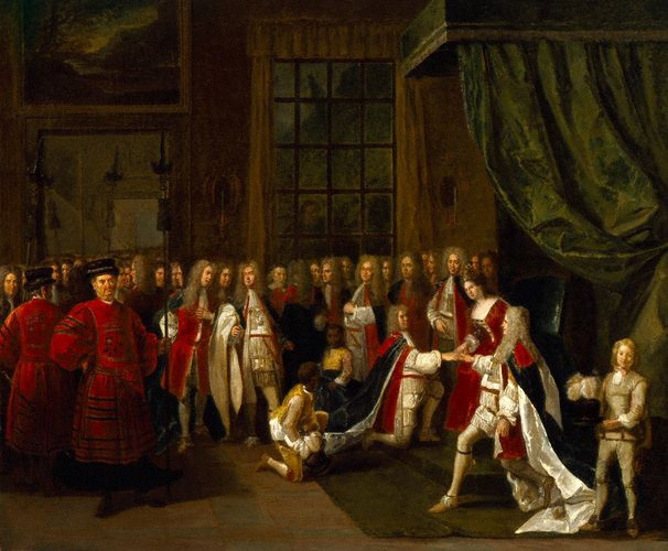 TITLE: Queen Anne DATE: RIGHTS STATUS: Has the right to distribute DESCRIPTION: Queen Anne and the Knights of the Garter (abt. 1720), by Peter Angelis. WIKI: FamilySearch Wiki