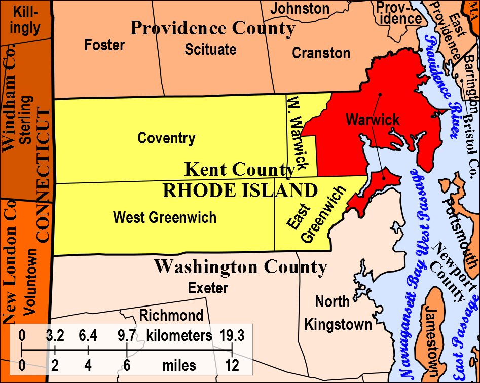 English: Town borders of Warwick, Kent, Rhode Island, USA, on a map of Kent County. |