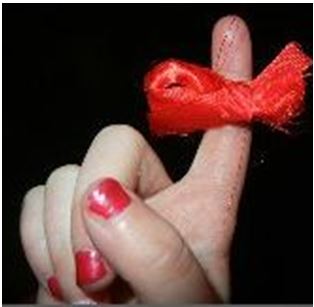 Red ribbon on finger | ||