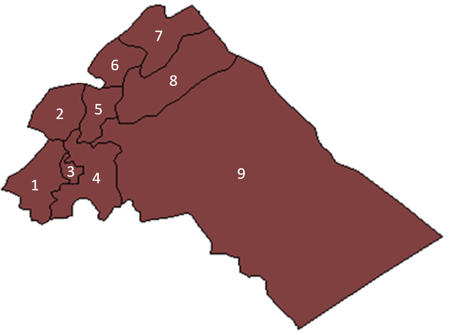 Blank map of Rif Dimashq's districts, as they were up to 2009, when a tenth district, Qudsaya District, was created out of parts of Markaz Rif Dimashq and Zabadani districts. |