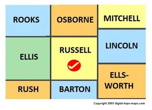 | current | ★ Approved revision 09:43, 13 September 2017 | 510 × 368 (32 KB) | Amberannelarsen (talk | contribs) | Map courtesy of [https://www.digital-topo-maps.com/county-map/kansas.shtml/ Digital-Topo-Maps.com]. Copyright 2005. Category:Kansas Maps Category: Russell County, Kansas |