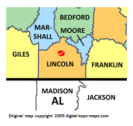 Thumbnail for version as of 09:37, 1 December 2018261 × 246 (30 KB)Djheaven (talk | contribs)Map courtesy of [https://www.digital-topo-maps.com/county-map/tennessee.shtml Digital-Topo-Maps.com]. Copyright 2005.<br> Category:Tennessee Maps Category:Lincoln County, Tennessee