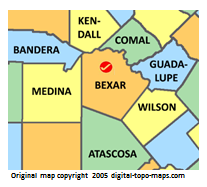 | current | ★ Approved revision 17:34, 13 June 2018 | 207 × 187 (26 KB) | Dotxinxoz (talk | contribs) | Map courtesy of [https://www.digital-topo-maps.com/county-map/Texas.shtml Digital-Topo-Maps.com]. Copyright 2005.<br> Category:Texas Maps Category:Bexar County, Texas |
