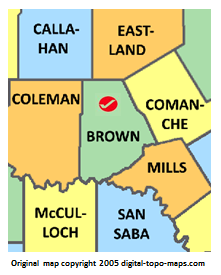 | current | ★ Approved revision 17:42, 13 June 2018 | 221 × 275 (36 KB) | Dotxinxoz (talk | contribs) | Map courtesy of [https://www.digital-topo-maps.com/county-map/Texas.shtml Digital-Topo-Maps.com]. Copyright 2005.<br> Category:Texas Maps Category:Brown County, Texas |
