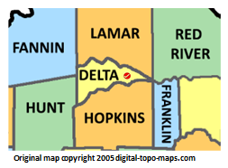 | current | ★ Approved revision 10:18, 14 June 2018 | 253 × 186 (27 KB) | Dotxinxoz (talk | contribs) | Map courtesy of [https://www.digital-topo-maps.com/county-map/Texas.shtml Digital-Topo-Maps.com]. Copyright 2005.<br> Category:Texas Maps Category:Delta County, Texas |