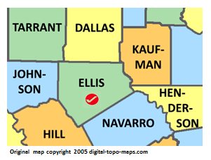 | current | ★ Approved revision 10:27, 14 June 2018 | 301 × 228 (35 KB) | Dotxinxoz (talk | contribs) | Map courtesy of [https://www.digital-topo-maps.com/county-map/Texas.shtml Digital-Topo-Maps.com]. Copyright 2005.<br> Category:Texas Maps Category:Ellis County, Texas |