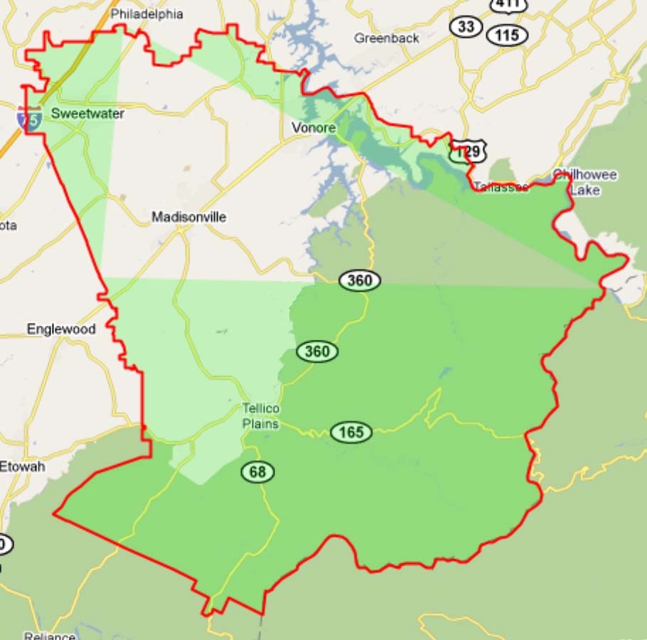 TITLE: TN-Monroe County Boundary Map DATE: RIGHTS STATUS: Has the right to distribute DESCRIPTION: http://maps.huge.info/county.htm. Used with permission of John Coryat, USNaviguide LLC. WIKI: FamilySearch Wiki