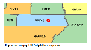 | current | ★ Approved revision 08:08, 4 September 2018 | 312 × 172 (15 KB) | Bethcottam (talk | contribs) | Map courtesy of [https://www.digital-topo-maps.com/county-map/utah.shtml]. Copyright 2005.<br> Category:Utah Maps Category:Wayne County, Utah |