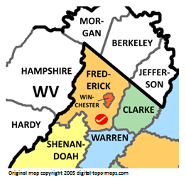| current | ★ Approved revision 16:09, 15 December 2018 | 262 × 252 (42 KB) | Stais (talk | contribs) | Map courtesy of [https://www.digital-topo-maps.com/county-map/virginia.shtml Digital-Topo-Maps.com]. Copyright 2005.<br> Category:Virginia Maps Category:Frederick County, Virginia |