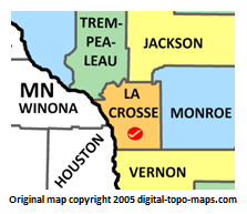 | current | ★ Approved revision 17:16, 24 November 2018 | 223 × 193 (24 KB) | Stais (talk | contribs) | Map courtesy of [https://www.digital-topo-maps.com/county-map/wisconsin.shtml Digital-Topo-Maps.com]. Copyright 2005.<br> Category:Wisconsin Maps Category:La Crosse County, Wisconsin |