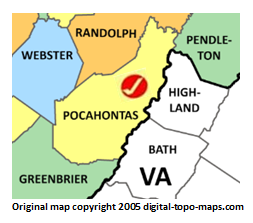 | current | ★ Approved revision 09:49, 9 April 2018 | 253 × 223 (35 KB) | Djheaven (talk | contribs) | Map courtesy of [https://www.digital-topo-maps.com/county-map/west-virginia.shtml Digital-Topo-Maps.com]. Copyright 2005.<br> Category:West Virginia Maps Category:Pocahontas County, West Virginia |