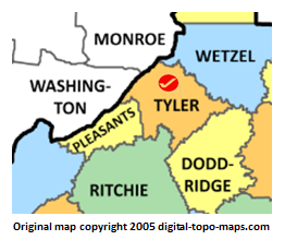 | current | ★ Approved revision 09:55, 9 April 2018 | 262 × 220 (42 KB) | Djheaven (talk | contribs) | Map courtesy of [https://www.digital-topo-maps.com/county-map/west-virginia.shtml Digital-Topo-Maps.com]. Copyright 2005.<br> Category:West Virginia Maps Category:Tyler County, West Virginia |