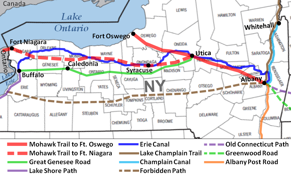 Description: Map of the Mohawk or Iroquois Trail to Fort Oswego and Fort Niagara, New York and connected migration pathways.
