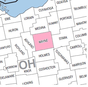 County borders of Wayne County, Ohio, USA, on a map of Ohio. |